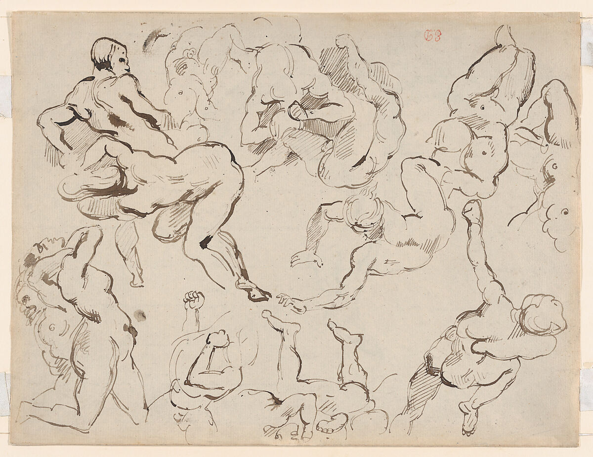 While preparing "The Raft of the Medusa," Géricault looked to the tormented and tangled bodies in Peter Paul Rubens’s "Little Last Judgment" (ca. 1621–22; Alte Pinakothek, Munich), making drawings after an engraving by Jonas Suyderhoef known as "Fall of the Damned." Here, Delacroix copied some of the same figures. He likely referred directly to the print, given that there are some falling figures here not seen in Géricault's work, yet his simplified manner of rendering the forms emulates that of his older friend.