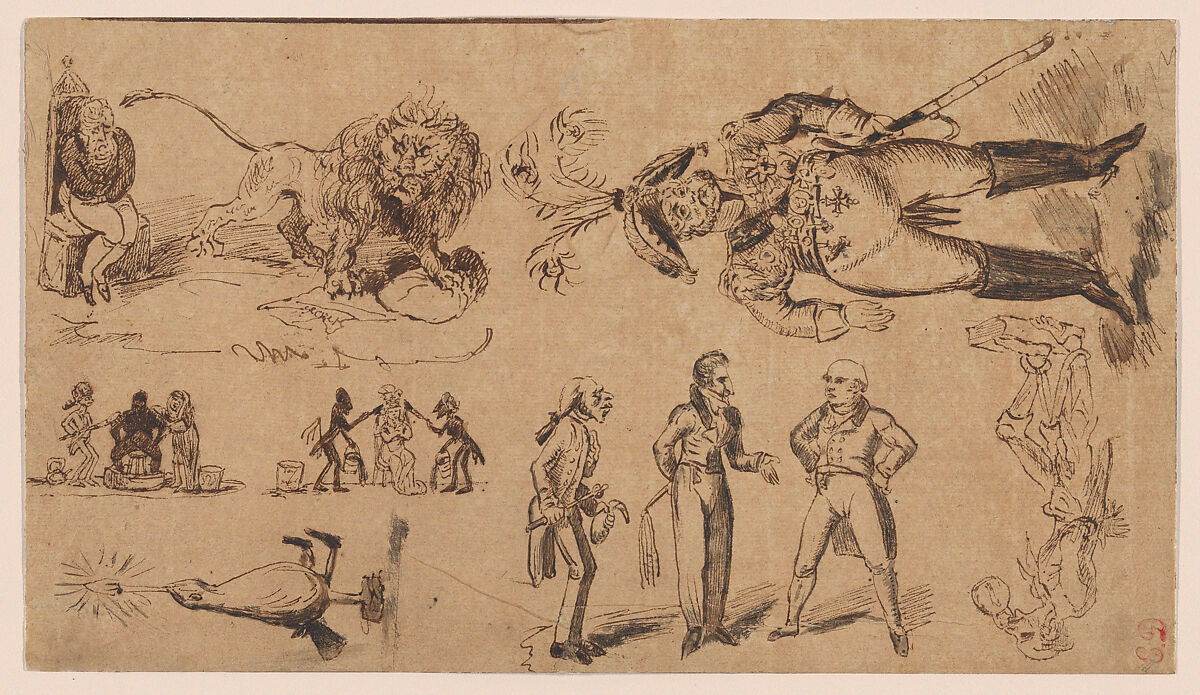 In addition to looking at earlier masters of British caricature such as James Gillray and Thomas Rowlandson, Delacroix copied compositions by his contemporary George Cruikshank. This sheet brings together six vignettes based on Cruikshanks’s illustrations for at least four different pamphlets of political parody by William Hone published between 1819 and 1821.