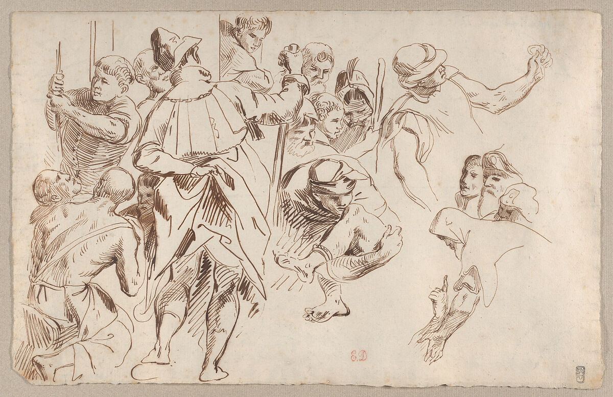 In this copy of a composition by the Italian Renaissance painter Paolo Veronese—likely based on the etching by Giuseppe Maria Mitelli (Italian, 1634–1718)—Delacroix omitted the central subject of his source, the body of Saint Sebastian. He included only his legs, supported by the figure hunched at the center of the drawing, and the displaced pointing hand at lower right. Delacroix focused instead on the arrangement and various attitudes of the attendant figures, drawing attention to those reacting to the event.