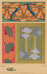 Plate, part of a collection of 30 pochoir pattern plates, originally part of a book titled "Les fleurs et leurs applications décoratives" (Flowers and their decorative applications), created by Émile-Allain Séguy and published in Paris by A. Calavas, as part of the collection "Librairie des Arts Decoratifs" (Library of Decorative Arts) in 1902. The plate features three ornamental designs inspired on the natural beauty of tulips, providing what Séguy considered a successful example of the application of scientific study of flowers in artistic creation, resulting in colorful designs likely intended for textiles or wallpapers. The first design, possibly intended for or inspired by stained glass, is made up of alternating large, semi-abstract tulips, executed with shades of brown and gold, flanked by scrolling branches, colored with blue, over a green ground. The second design is made up of a vertical, undulating branch with semi-abstract tulips, colored with orange, and leaves, colroed with green, over a vertical stripe, colored with purple, framed between two thinner stripes, colored with a lighter shade of purple. The third design is made up of alternating bundles of semi-abstract tulips and leaves, executed with light shades of purplish-blue, over a green ground.