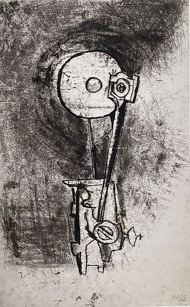 Here the same motif, a mechanomorphic creature assembled from a variety of nuts, bolts, screws, and tools, is rendered once on each side of a piece of paper using different techniques. On one side, the creature is surrounded by a halo of expressionistic black marks. On the other, it is starkly isolated against a more or less bare background. Early in her career, before immigrating to New York in 1941, Sterne had strong ties to the European Dada and Surrealist movements, especially through her family friend, Victor Brauner. Her debt to Dada and Surrealism is very much in evidence here.
