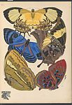 Fourth plate of album with 20 pochoir pattern plates, titled "Papillons: vingt planches en phototypie coloriées au patron donnant 81 papillons et 16 compositions décoratives" (Butterflies: twenty plates with colored phototypes with patterns with 81 butterflies and 16 decorative compositions), created by Emile-Allain Séguy and published in Paris by Tolmer Éditeur, probably in the 1920s. The plate features five naturalistic illustrations of exotic butterflies from Guyana, Brazil, and India, executed with shades of brown, blue, yellow, green, black, and burgundy-red. The depictions of butterflies in the illustration are remarkably detailed, revealing Séguy's unique interest in the scientific study of insects as a source of inspiration for artistic creation. This illustration was likely meant to inspire designs for textiles and wallpapers.