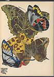 Fifteenth plate of album with 20 pochoir pattern plates, titled "Papillons: vingt planches en phototypie coloriées au patron donnant 81 papillons et 16 compositions décoratives" (Butterflies: twenty plates with colored phototypes with patterns with 81 butterflies and 16 decorative compositions), created by Emile-Allain Séguy and published in Paris by Tolmer Éditeur, probably in the 1920s. The plate features five naturalistic illustrations of exotic butterflies from Australia, Guyana, Brasil, and Peru, executed with shades of brown, green, blue, yellow, and red. The depictions of butterflies in the illustration are remarkably detailed, revealing Séguy's unique interest in the scientific study of insects as a source of inspiration for artistic creation. This illustration was likely meant to inspire designs for textiles and wallpapers.