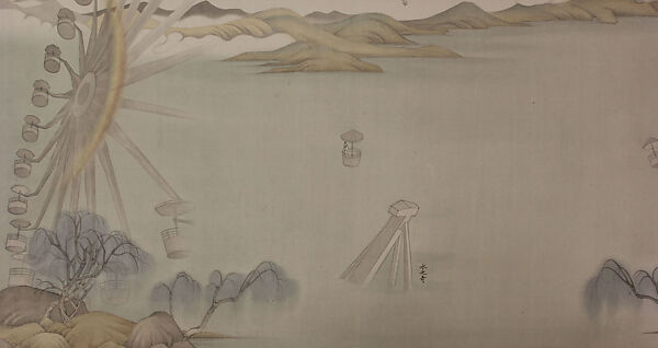 This work is a complex and layered homage to the history of literati gardens. The scroll begins by reimagining the most famous garden painting in Chinese history, Wang Wei’s (699–759) Wangchuan Villa, as a series of ghostly ruins. Slowly, the scroll transitions to color from black and white. The painting then shifts to an exploration of the Ming-dynasty garden of the scholar Wang Shizhen, in Taicang, Jiangsu. From there, Hao takes the viewer on a journey to the present day, where Wang’s garden, which was destroyed in the twentieth century, has been rebuilt. The new garden features a garish Ferris wheel, which Hao shows spinning off its axis and spewing its cars across the scroll, across boundaries of space and time.