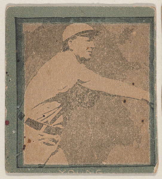 "Cy" Young, (5) from the Baseball strip card candy series trade cards possibly related to the Jay S. Meyer Base Ball Snap Shots candy series (W555) produced by Jay S. Meyer Confectioners, Philadelphia. Cut off a candy package or box these cards. Black and white photo of player with thin black border and dark green edge. Last name in white capital letters across bottom of card.