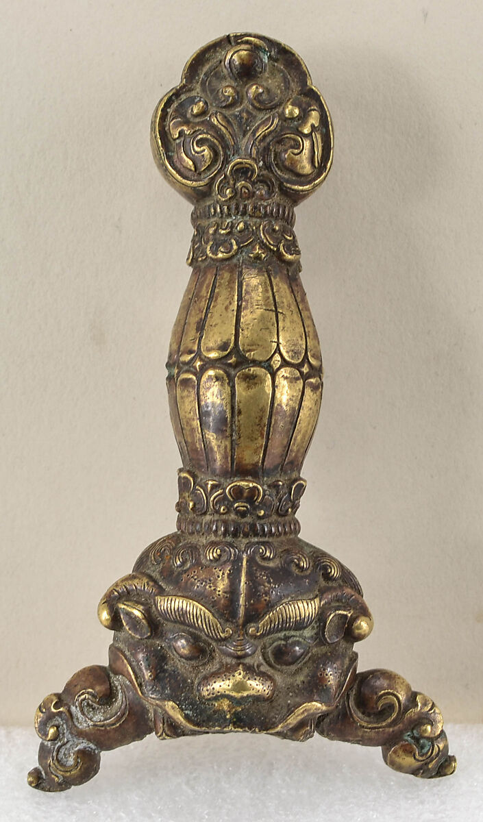 The hilt is cast in one piece, with decoration in low relief accented by engraved details. The pommel has a trilobate or trefoil form and probably represents the Three-Eyed Gem (Tibetan, nor bu mig gsum pa), which is derived from the Chinese ju-i motif and is one of a group of auspicious symbols known in Tibet as the Seven Gems (norbu cha bdun). It is decorated on the front with three dots framed by curly leaves or scrolls. The sides and back of the pommel are plain and there is a square opening at the top. The grip swells at the center and is round in cross section. It is decorated all the way around with two rows of stylized lotus petals. The borders or collars at the top and bottom of the grip consist of a continuous circle of triple petal or ju-i symbols set on a beaded ring. At the base of the grip the guard is a very leonine form of kirttimukha mask (Tibetan, tsi pa Ta) with a short downward curving leafy scroll extending from either side of the mouth. Ringlets of curly hair create an arc across the top of the back of the guard. Two locks or tendrils extend upward from the base, representing hair on the lower lip or chin of the mask. The bottom of the guard is open to accommodate the tang and shoulders of its missing blade. The opening is framed by teeth and fangs indicating the opening as the mouth of the mask, as is typical on hilts of this type.