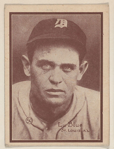 Lu Blue, (50) St. Louis A.L. from the Baseball trade card series (W517). Believed to have been produced by Exhibit Supply Company. Thick stock, vertical shape -- three to a box -- in various tints including sepia, magenta, green etc. Large-scale card distributed in strips with dotted line used for cutting. Player's name, team, league, and card number (in circle) at lower portion of card. Player in portrait style or action-pose. Back is blank. 54 cards in set.