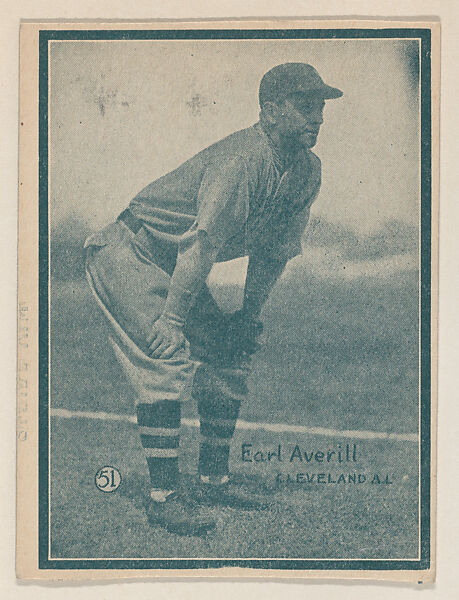 Earl Averill, (51) Cleveland A.L. from the Baseball trade card series (W517). Believed to have been produced by Exhibit Supply Company. Thick stock, vertical shape -- three to a box -- in various tints including sepia, magenta, green etc. Large-scale card distributed in strips with dotted line used for cutting. Player's name, team, league, and card number (in circle) at lower portion of card. Player in portrait style or action-pose. Back is blank. 54 cards in set.