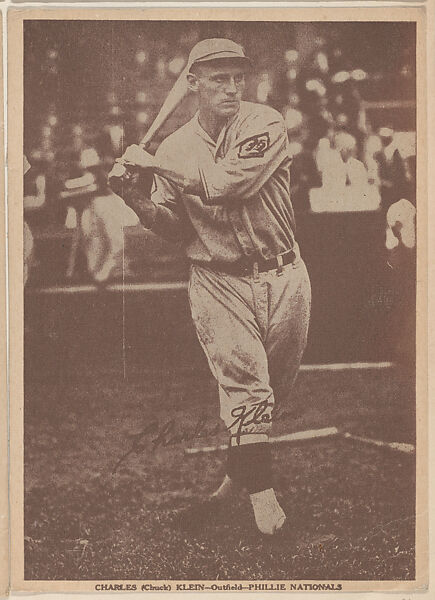 Charles (Chuck) Klein, Outfield, Phillie Nationals, Baseball trade cards (W554). Unnumbered. Brown-toned, heavy stock, oversized card. Full-length action-posed player. Facsimile signature printed within image. Player's name, position and team printed at bottom white border. Back is blank. 18 cards in set.