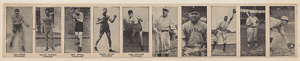 Intact Baseball strip cards (five) with Boxing cards (W572). Unnumbered cards printed side by side in groups of 10. Full-length action-posed boxers and baseball players. Back is blank. The manufacturer of these cards is not known but it is believed that they were distributed with the 1923 W580 boxing strip cards. This strip contains (from left to right): Ted Lewis, Welterweight; Willie Ritchie, Lightweight; Abe Attell, Featherweight; Harry Wills, Heavyweight; Jack Britton, Welterweight; Jimmy Johnston, Brook.N.L.; Steve O'Niell [sic] (O'Neill), Cleve. A.L.; Ken Williams, St. Louis A.L.; Rogers Hornsby, St. Louis N.L.; Frank Frisch, New York, N.L. Copyright symbol CIFS (Copyright International Feature Service) included on front of Baseball player cards.