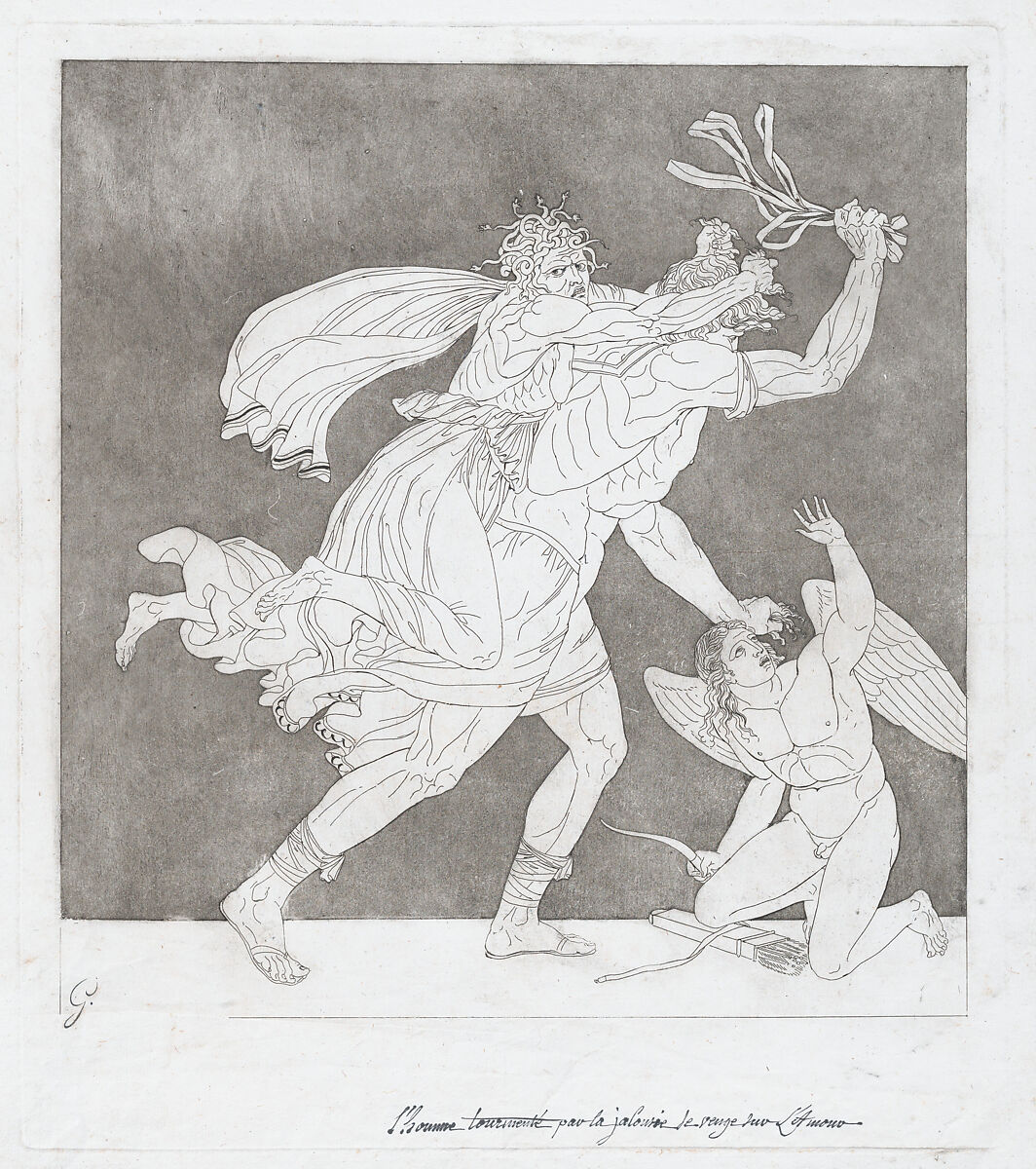 In this etching, Gagneraux depicts a large, powerful man in antique dress. He is tormented by jealousy, represented by a frightening old woman with snakes instead of hair who rides on his back by gripping fistfuls of his hair. He in turn prepares to strike Cupid, who kneels on the ground and raises an arm in self-defense. Gagneroux accentuates the planar quality of the composition by adding a dark background in aquatint. The print is a variant of a smaller format line engraving he made as part of a publication of 18 outline prints in 1792. He has carried over the unusual subject, but altered many details, adding classical sandals to the man and giving a Medusa-like head of snakes to the figure of Jealousy.