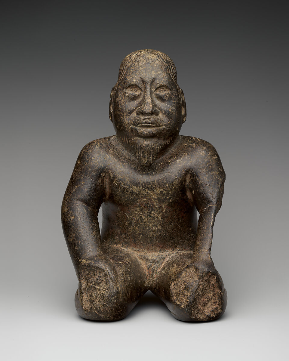 Depicting a kneeling figure, this intimately scaled sculpture is notable for its harmonious proportions, subtle musculature, and dynamic pose. The bearded man rests his hands on his knees, wearing a loincloth but otherwise unadorned. As is characteristic of Olmec-period sculpture, the head is elongated, perhaps a representation of cranial modification, a cultural practice where the head of an infant is gently shaped. The deeply carved eyes may have once held inlays of shell or stone, and details of the coiffure, ears, and beard are delicately incised. The hands and feet were broken off in antiquity and the left arm has also suffered losses.