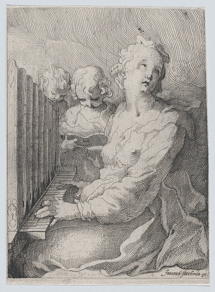 St. Cecilia no doubt had personal meaning for Pietersz. because his brother, Jan PIetersz. Sweelinck, was a composer and organist, and his father was also an organist. Here Pietersz. sets Cecilia in the celestial rather than the worldly realm, accompanied by two young angels. She is seated at an organ, an instrument she was thought to have invented, though in fact it dates from a much earlier period.
