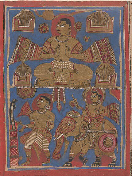 The Brahmin “heretic” Kamatha performs penances to test his faith before his conversion to Jainism. Four fires burn in altars and a fifth is represented as the blazing sun, seen to the left of the Brahmin’s head. In the lower register, Parsvanatha, the twenty-third jina, overseen by a lesser god (deva) on an elephant, rescues a snake from a woodcutter who disturbs it in a log. This snake proves to be the Naga king Dharana, who later protects the jina from floods and other calamities.