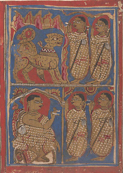 - Title: Sthulabhadra as a Lion in a Cave With His Sisters (top) / Sthulabhadra's Sisters Before Bhadrabahu (or Sthulabhadra) (bottom); Page from a Dispersed Kalpa Sutra (Jain Book of Rituals)