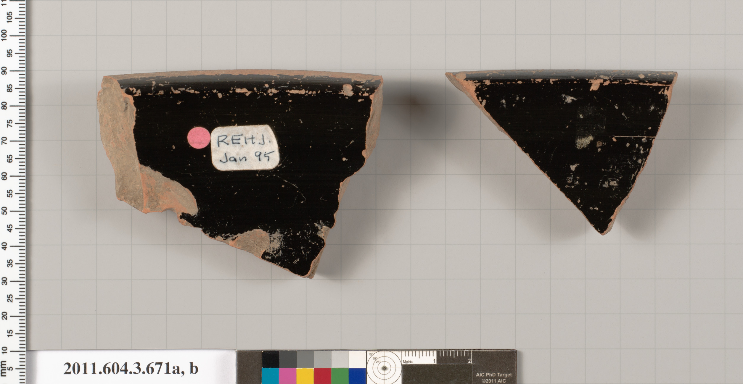 One fragment has below the rim, a nude youth mounted on a horse to right; a second fragment has below the rim, the head, neck, right shoulder, part of the bent arm, and mane of a horse of a mounted, nude youth to right