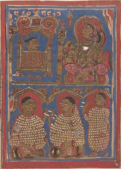 - Title: Vajra in His Cradle (top left) / Vajra Being Nursed by His Mother (top right) / The Nuns who Cared for Vajra (bottom); Page from a Dispersed Kalpa Sutra (Jain Book of Rituals)