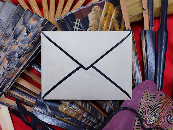 At the hour of tea displays various tableaux of luxurious, slightly anachronistic collectibles such as a pocket watch, Japanese fans, and Roman coins, against the green baize backdrop of a desktop. Every so often clips of various typewritten notecards punctuate the film, and the fragmentary text on the notes in turn describes a painting. The cards as well as the envelope from which they emerge are edged in black—stationary that was usually used for a death announcement—which adds to the film’s slightly melancholy atmosphere.