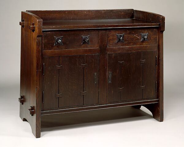 In 1899, Gustav Stickley, a leading designer and proselytizer of the American Arts and Crafts movement, founded the Craftsmen Workshops (called United Crafts before 1904) to manufacture his line of furniture. Simply designed for ease of manufacture, Craftsman furniture was modestly priced to appeal to the average American. The massive tenon-and-key joints protruding from the ends of this sideboard and the bold butterfly joints on the doors are typical of early Stickley designs in which structural elements are accentuated for decorative effect. The 1901 Stickley catalogue "Chips from the Workshops of Gustave [sic] Stickley, Syracuse, N.Y., U.S.A." illustrated this form as "Side Board No. 901." The sideboard bears a decal with an early Stickley mark, used only in 1902 and 1903, as well as the label of a retailer. The square, faceted iron drawer pull on the sideboard is found most often in pieces dating from 1901 to 1903, but this hardware continued to be offered in Stickley sales catalogue until at least 1905.