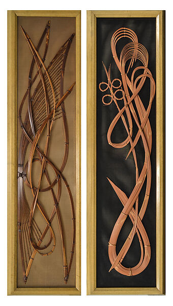 Iizuka Shōkansai is a master bamboo artist, designated a Living National Treasure in Japan. Son of the famous bamboo artist Iizuka Rōkansai (1890–1958), he first studied oil painting before becoming a student of his father and a participant in the established lineage of Kantō (eastern Japan) craftsmen. Having mastered classic methods of plaiting, he produced bamboo baskets and other functional works of art in traditional shapes and styles using combinations of bamboo, rattan, and lacquer, but during the 1960s he also produced experimental pieces inspired by abstract painting. This particular work takes the form of two flat, framed panels appropriate for hanging. Created from timber bamboo (madake), rattan, and a metal background, its primary component is lengths of split, pliable bamboo worked in bundled plaiting (tabane-ami). The dynamic, abstract composition displays the tensile strength of the material. The occasionally interlaced bundles of bamboo form graceful, curvilinear patterns held in place against the metal background by thin pieces of rattan.
