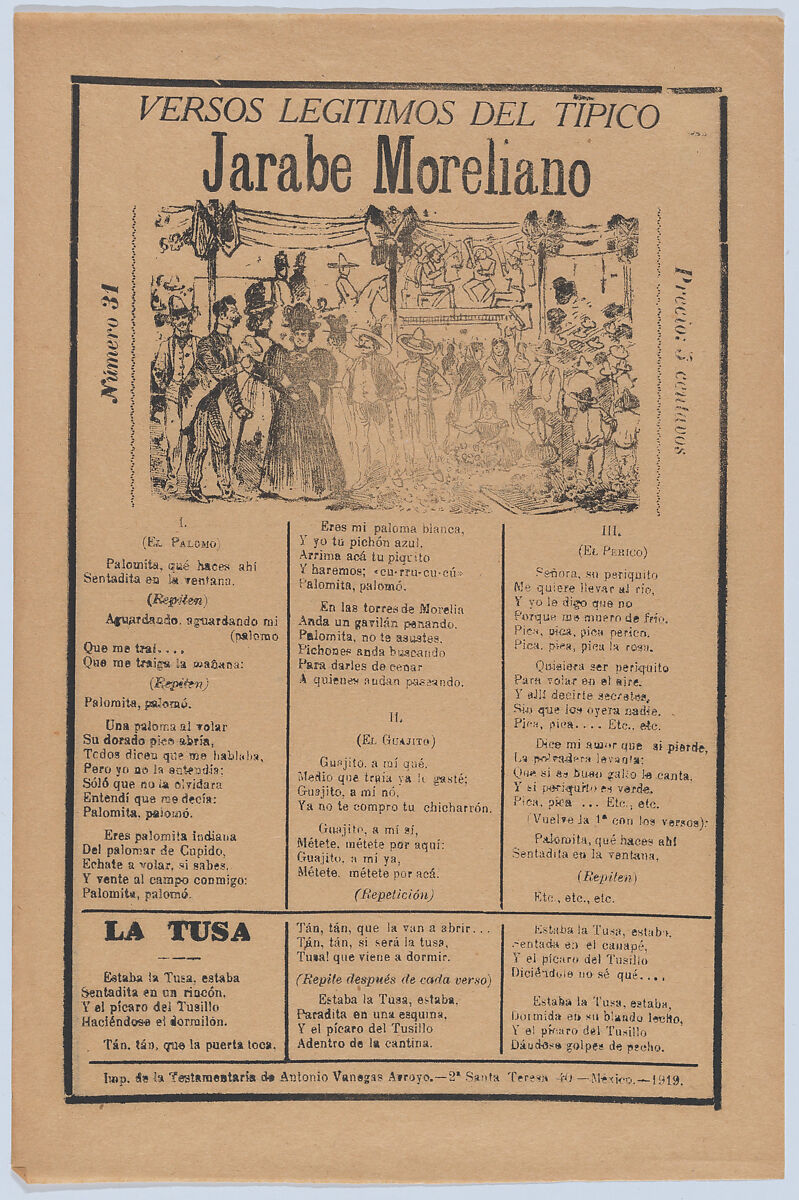 - Title:Broadsheet with songs for a Mexican courtship dance called the 'Jarabe Moreliano', a crowd of people and muscians