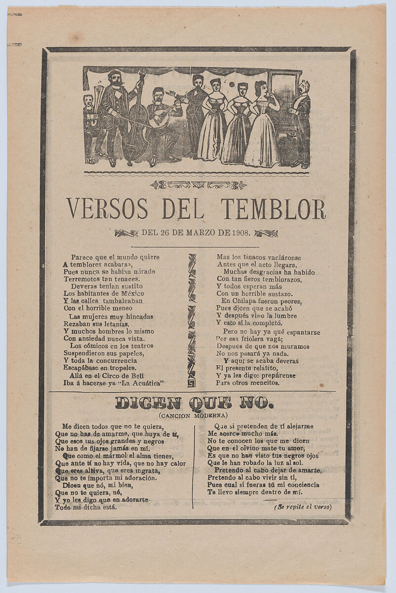 - Title: Broadsheet with songs relating to the earthquake that occurred on March 26, 1908