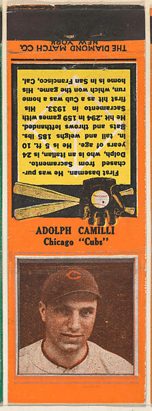 - Title:Adolph Camilli, Chicago Cubs, from the Baseball Players Match Cover design series (U1) issued by Diamond Match Company