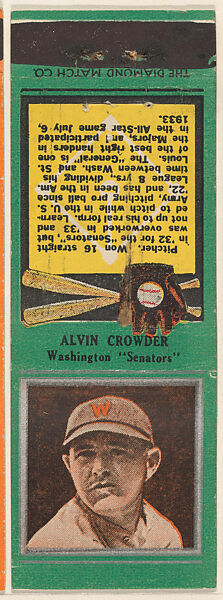 - Title: Alvin Crowder, Washington Senators, from the Baseball Players Match Cover design series (U1) issued by Diamond Match Company