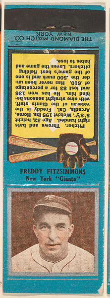 - Title:Freddy Fitzsimmons, New York Giants, from the Baseball Players Match Cover design series (U1) issued by Diamond Match Company