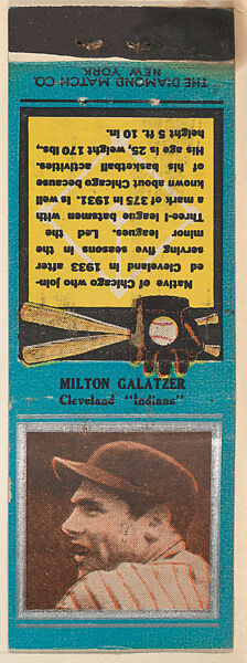 - Title:Milton Galatzer, Cleveland Indians, from the Baseball Players Match Cover design series (U1) issued by Diamond Match Company