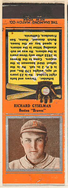 - Title:Richard Gyselman, Boston Braves, from the Baseball Players Match Cover design series (U1) issued by Diamond Match Company