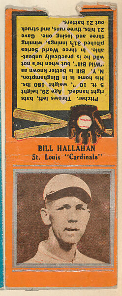 - Title:Bill Hallahan, St. Louis Cardinals, from the Baseball Players Match Cover design series (U1) issued by Diamond Match Company