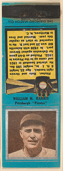 - Title:William M. Harris, Pittsburgh Pirates, from the Baseball Players Match Cover design series (U1) issued by Diamond Match Company