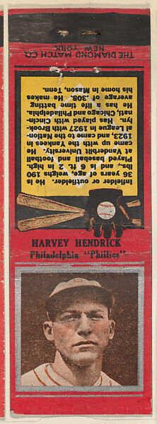 - Title:Harvey Hendrick, Philadelphia Phillies, from the Baseball Players Match Cover design series (U1) issued by Diamond Match Company