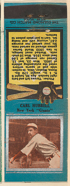 - Title:Carl Hubbell, New York Giants, from the Baseball Players Match Cover design series (U1) issued by Diamond Match Company