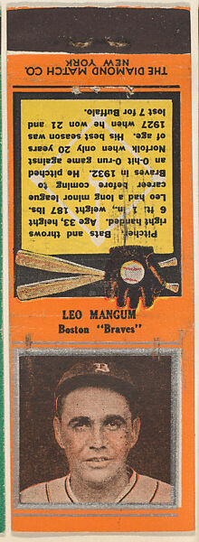 - Title:Leo Mangum, Boston Braves, from the Baseball Players Match Cover design series (U1) issued by Diamond Match Company