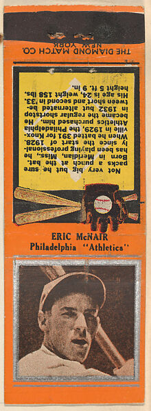 - Title:Eric McNair, Philadelphia Athletics, from the Baseball Players Match Cover design series (U1) issued by Diamond Match Company