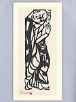 To create these images of Buddhist disciples and a bodhisattva, Munakata Shikō—the most highly acclaimed Japanese print artist of the twentieth century—gouged magnolia wood blocks with every ounce of energy he could muster. Munakata, like carvers of Buddhist and Shinto sculptures in ancient times, believed he was drawing life out of the wood, and that he was giving expression to the primordial spiritual energy of nature. Munakata’s prints were discovered in the mid-1930s by the prominent art critic Yanagi Sōetsu, who was an advocate for mingei, or “folk art,” which he saw as embodying two quintessential aspects of Japanese art: a deep respect for the materiality of the medium and a bold, direct, unselfconscious mode of expression. Munakata’s mingei approach was further enhanced by his immersion in Zen philosophy as well as by his fascination with European experiments in Post-Impressionist art—van Gogh, whom he idolized, as well as the German Expressionists—which enabled him to create an entirely new style of Japanese woodcut that propelled him to international fame. In 1955 he won the top award for prints at the São Paulo Biennale, and in 1956 he received the Grand Prize for printmaking at the Venice Biennale. In 1959 he visited New York at the invitation of the Japan Society and the artistic career of this self-taught son of a blacksmith from rural northern Japan would never again be the same.