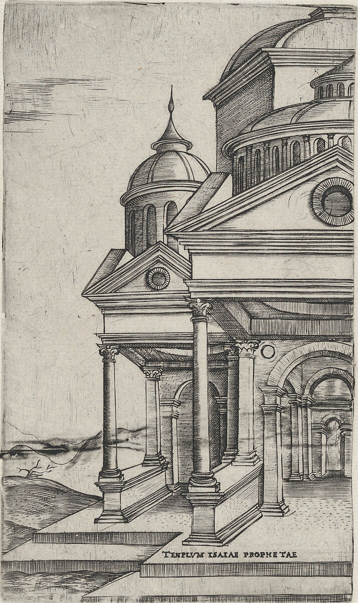 Perspectival depiction of the left part of a temple, referred to as the ‘Tenplum [sic] Isaiae Prophetae’ placed on a two-stepped podium and set in a stylized landscape. The building is characterized by a domed tower and separate cupola over the central bay. The left side of the building is marked by an avant-corpse that mirrors the central entrance and is crowned by a small cupola with a tall drum and a pointed tip.
