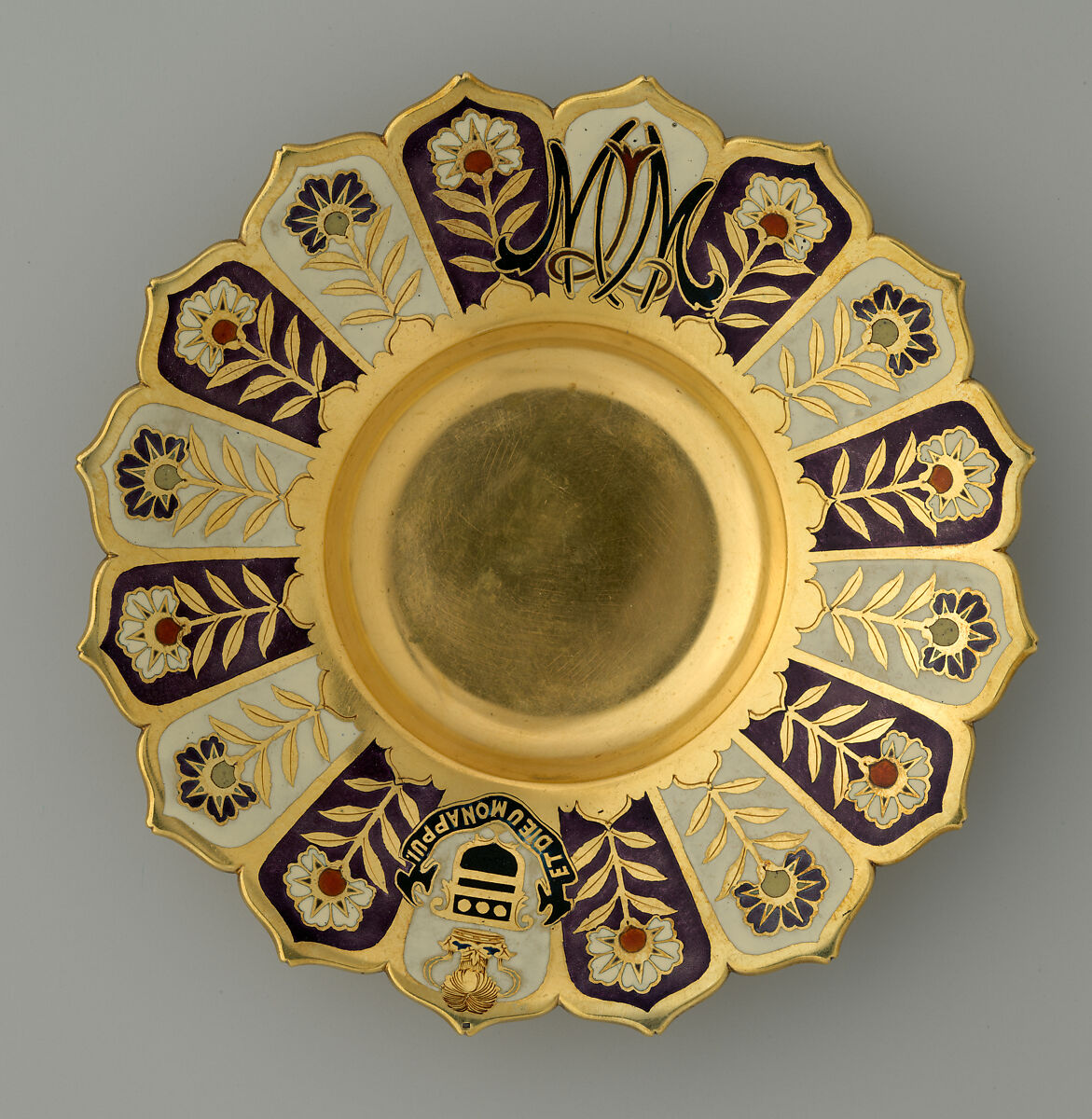 These gilded and enameled cups and saucers are part of one of the most renowned and lavish dinner services ever created in America. Commissioned in 1877 by John W. (1831-1902) and Marie Louise Hungerford (1843-1928) Mackay, the dinner service for twenty-four consisted of over 1,250 pieces. A poor Irish immigrant with little education, John W. Mackay became one of the wealthiest men in America when he and three partners, James Fair, James Flood, and William O’Brien, struck a silver deposit known as "The Big Bonanza" at Nevada’s Comstock Lode in 1873. During a visit to the mine, Marie Louise asked her husband for a silver dinner service "made by the finest silversmith in the country." Her husband responded, "You shall have it. I like the notion of eating off silver brought straight from the Comstock." He proceeded to have a half ton of silver delivered from the mine to Tiffany & Co., where two hundred men worked for almost two years to complete the commission. After being snubbed by New York City society, the Mackays established themselves in Paris. In 1878 the service was sent to be featured in Tiffany’s award-winning display at the Paris Exposition Universelle before being delivered to the Mackay’s home at 9 Rue de Tilsitt near the Arc de Triomphe. In an era of extravagant social affairs, Mrs. Mackay’s dinners and balls were legendary. The Mackay dinner service would have been at the center of banquets that included royalty, aristocracy, President and Mrs. Ulysses S. Grant, and one of the most prominent celebrities of the day, Buffalo Bill. Identified in firm records as "Indian" in style, the Mackay service reflects the sophisticated and innovative design sensibilities of Edward C. Moore, the head of Tiffany’s silver division, and the team of designers, chasers, and craftsmen who conceived and realized this commission. The exquisite cloisonné enameled decoration on these cups embodies Gilded Age extravagance and would have offered a dazzling finale to a meal served on a sea of elaborately chased silver wares in an "exotic" Indian and Near Eastern taste.