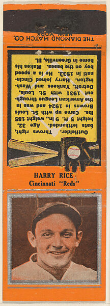 - Title:Harry Rice, Cincinnati Reds, from the Baseball Players Match Cover design series (U1) issued by Diamond Match Company