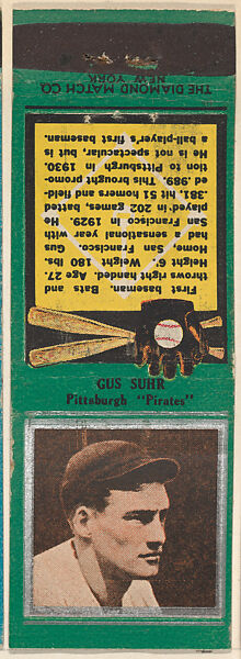 - Title:Gus Suhr, Pittsburgh Pirates, from the Baseball Players Match Cover design series (U1) issued by Diamond Match Company