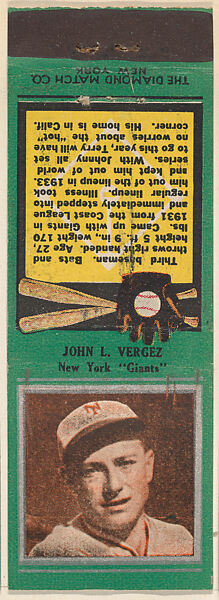 - Title: John L. Vergez, New York Giants, from the Baseball Players Match Cover design series (U1) issued by Diamond Match Company