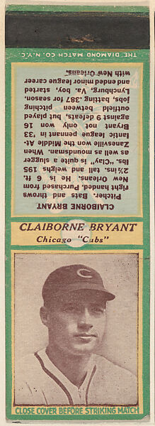 Claiborne Bryant, Chicago Cubs, from the Baseball Players Match Cover design series (U3) issued by Diamond Match Company