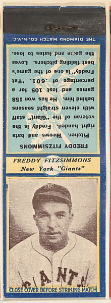 - Title: Freddy Fitzsimmons, New York Giants, from the Baseball Players Match Cover design series (U3) issued by Diamond Match Company