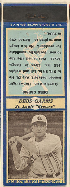 - Title:Debs Garms, St. Louis Browns, from the Baseball Players Match Cover design series (U3) issued by Diamond Match Company