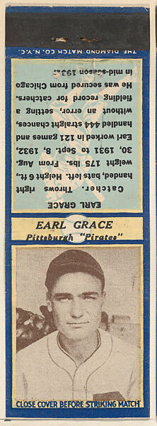 - Title:Earl Grace, Pittsburgh Pirates, from the Baseball Players Match Cover design series (U3) issued by Diamond Match Company