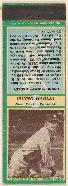 - Title:Irving Hadley, New York Yankees, from the Baseball Players Match Cover design series (U3) issued by Diamond Match Company