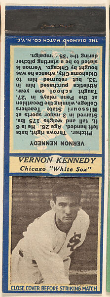 - Title: Vernon Kennedy, Chicago White Sox, from the Baseball Players Match Cover design series (U3) issued by Diamond Match Company
