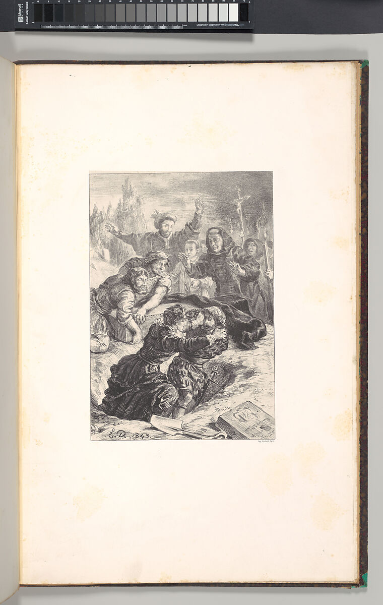 Novelist and playwright Paul Meurice purchased the "Hamlet" lithographic stones at Delacroix’s 1864 estate sale. He then arranged for the publication of a second edition of two hundred copies, which included three designs that had been omitted in 1843. In this scene, Ophelia’s brother, Laertes, blames Hamlet for her death, and the two men fight by her gravesite. The wide-eyed expressions of the gathered crowd, crowned by Horatio with his arms flung wide, serve to heighten the emotion of the struggle between the protagonists.